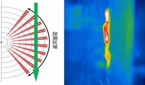 但由于菲涅爾透鏡的原因,能夠聚焦和劃分明暗空間,所以實(shí)際使用上正確的觸發(fā)方式是人體切割射線區(qū)域(如下圖紅色區(qū)域)。筆直超向探測(cè)器行走,可能會(huì)發(fā)生漏報(bào)(無法切割紅色區(qū)域)。