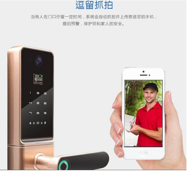 監(jiān)控攝像頭和智能鎖連接一體,起到有效防范和震懾作用,當有人在門口停留一定時間,系統(tǒng)會自動抓拍并傳送到手機,提前預警,保護家人安全。
